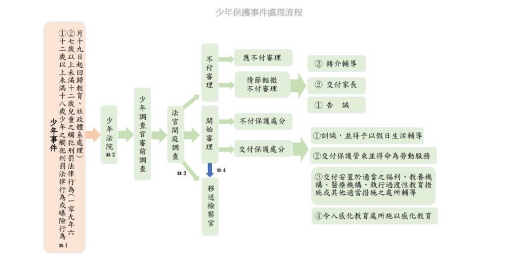 少年事件的定義為12歲以上未滿18歲者有觸犯刑罰或犯法機率高的曝險行為。觸犯刑罰的行為又稱為非行行為,如偷東西、打架、騎車撞傷人、殺人、妨害性自主、使用一二級毒品等;曝險行為則像是沒有正當理由攜帶刀械、吸食搖頭丸、預備犯罪或犯罪未遂等。少年保護事件在法院處理前會先進行少年調查官調查和法官調查,並依其調查結果決定是否進行審理,如認為不需要就裁定不付審理(詳見少年保護事件流程圖);如認為是重罪(最輕本刑為五年以上有期徒刑)或已滿20歲,裁定將案件轉移給檢察官偵辦(少年刑事案件);如需繼續處理,裁定開始審理,進行協商式審理(少年調查官出庭說明審查和處理的意見,法院和少年調查官、少年、法定代理人一同討論,法官依調查證據及審理結果裁定保護處分或不負保護處分。(詳見少年刑事案件處理流程圖)